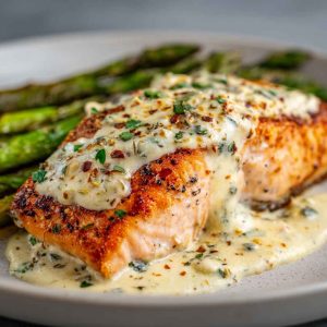 Serve this creamy, herbaceous salmon alongside roasted baby potatoes, garlic sautéed green beans, or a refreshing quinoa salad for a well-rounded plate. For wine, a crisp Sauvignon Blanc cuts through the richness, while an oaked Chardonnay complements the buttery cheese notes beautifully. This dish is versatile enough to serve as an elegant dinner party centerpiece when plated with care or a cozy, comforting family meal. Garnish with fresh herbs and lemon wedges to add a pop of color and brightness.
