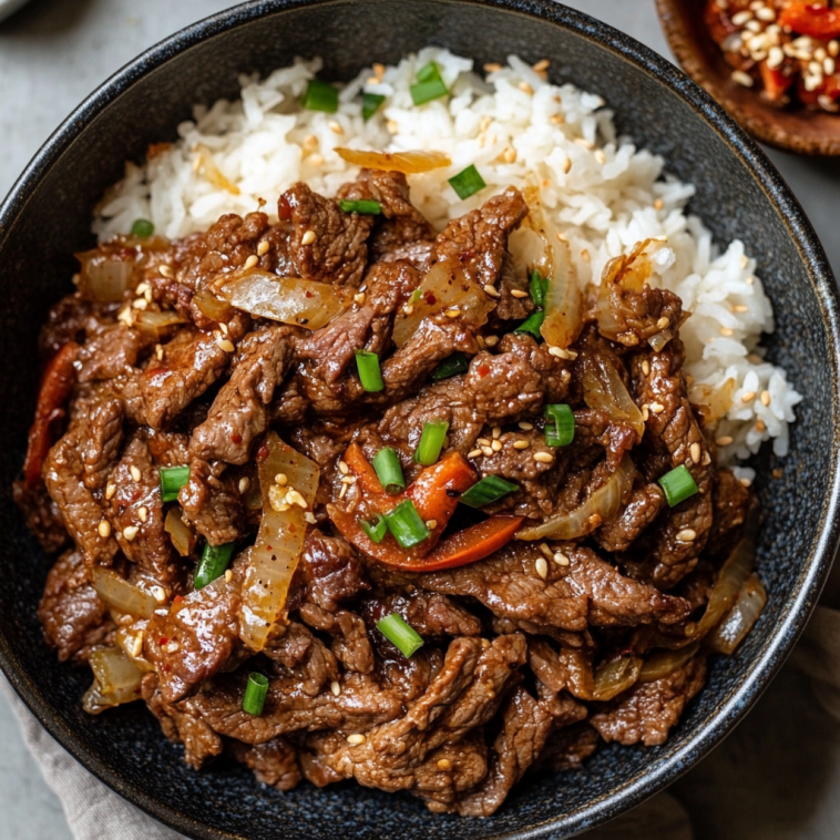 Beef Bulgogi is a delicious and flavorful Korean BBQ dish that’s easy to make at home. Thin slices of beef are marinated in a sweet and savory sauce and then quickly cooked to perfection. It’s typically served with rice and enjoyed with various side dishes, making it a fantastic meal for any occasion.