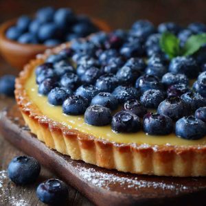 Imagine slicing into a tart with a crisp, buttery shell, revealing a silky lemon curd that is perfectly balanced between tart and sweet. Adorning the curd are plump, juicy blueberries, their deep blue color contrasting beautifully with the vibrant yellow of the lemon filling. This is not just a dessert; it’s a show-stopping centerpiece that delights both the eyes and the palate.