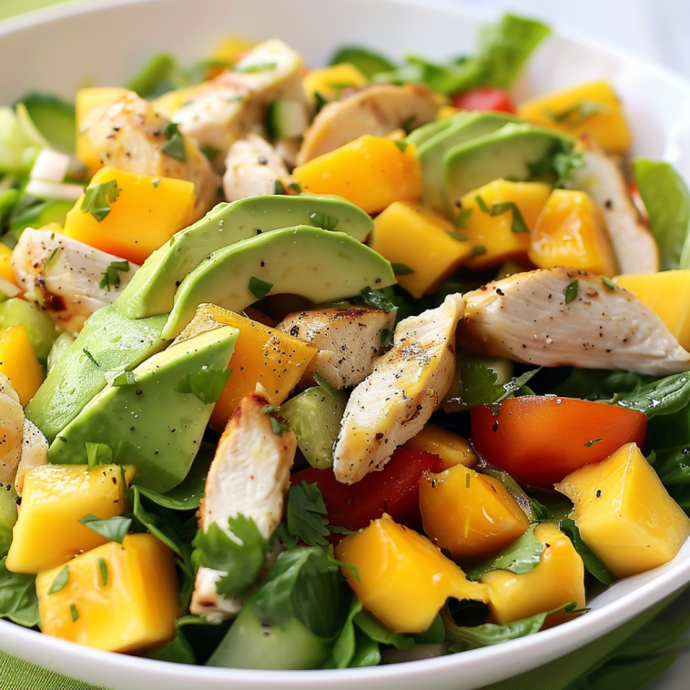 Chicken Mango Avocado Salad is a vibrant and refreshing dish that combines the flavors of grilled or cooked chicken, sweet mango, creamy avocado, and often other fresh ingredients like greens, tomatoes, and a light dressing. It’s a perfect blend of savory, sweet, and creamy textures, making it a popular choice for a healthy meal. Here’s a simple recipe to try: