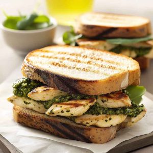 • Assemble sandwich: Spread pesto on bread slices. Layer chicken, mozzarella, tomatoes, and greens. Add any optional fillings or condiments. Top with remaining bread.