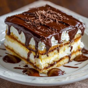 Chocolate Eclair Cake is a no-bake dessert inspired by the French éclair, but instead of delicate pastry, it uses layers of graham crackers or ladyfingers to create a simple yet decadent treat. This American adaptation swaps the labor-intensive pastry shell for an easier approach, layering creamy vanilla pudding or custard with whipped topping and finishing it all off with a glossy chocolate glaze. The dessert captures the essence of the classic éclair’s creamy filling and chocolate coating, but with less fuss and more comfort-food vibes. Its popularity comes from being a convenient shortcut to rich, elegant flavors without needing to master pastry techniques. Whether served at holidays, potlucks, or casual get-togethers, it’s a beloved favorite that satisfies chocolate and vanilla cravings alike.