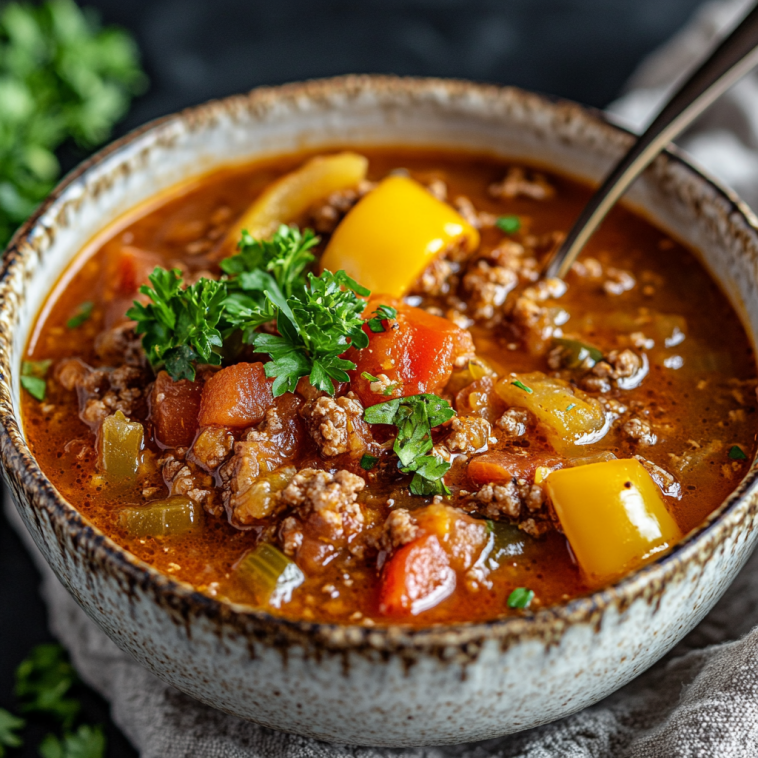 Enjoy the warmth and comfort of this stuffed pepper soup—perfect for chilly days!