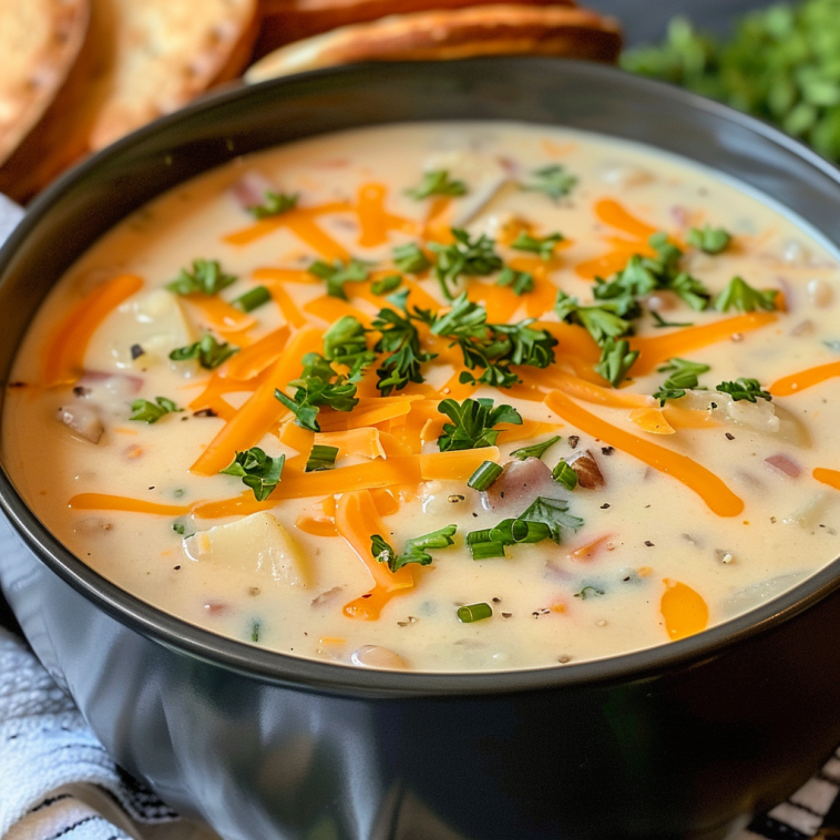 - Serve: Ladle the soup into bowls and garnish with chopped green onions, bacon bits, and additional shredded cheese.