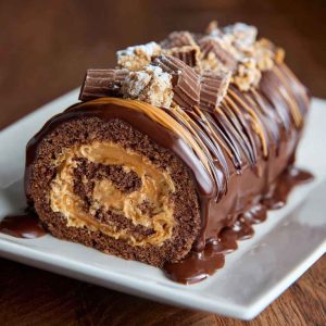 A peanut butter cup chocolate roll is a rolled sponge cake filled with creamy peanut butter frosting and finished with a glossy chocolate ganache. Unlike a Swiss roll, which often features jam or whipped cream, or a yule log, which is decorated to resemble a log, this roll focuses on the bold pairing of peanut butter and chocolate. The sponge itself is rich and cocoa-forward, baked thin so it can be rolled without cracking. Inside, the filling is smooth and nutty, echoing the flavor of peanut butter cups. The ganache topping adds indulgent richness, while chopped peanut butter cups scattered on top provide texture and visual appeal. This dessert elevates the familiar candy into a bakery-worthy centerpiece, combining nostalgic flavors with patisserie technique. It’s versatile too—serve it as a holiday dessert, a birthday cake alternative, or simply as a decadent treat for peanut butter lovers.