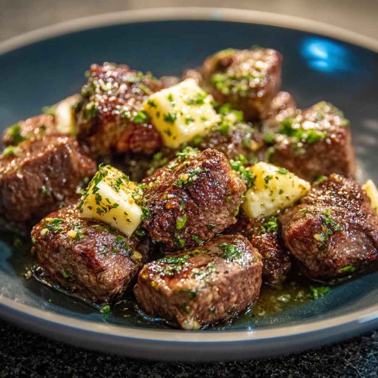 Now your steak bites are seared, juicy, and bathed in irresistible garlic butter goodness—ready to be devoured!