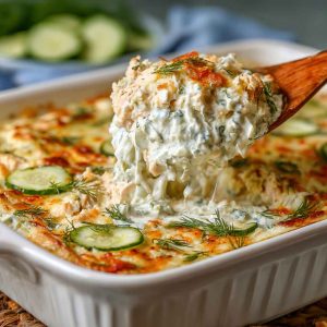 The star of the casserole is the tzatziki sauce, a creamy combination of Greek yogurt, cucumber, garlic, lemon, and dill that adds a refreshing tang to every bite. Juicy chicken breasts or thighs soak up the aromatic Mediterranean seasonings, while optional vegetables like bell peppers, zucchini, or tomatoes add color, texture, and nutrition. Layering these ingredients in a casserole allows flavors to meld beautifully during baking, giving each serving a balanced combination of creaminess, tang, and savory depth.