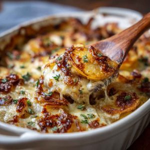 A rich, elegant twist that layers thin-sliced potatoes with a mixture of cream or milk, French onion soup, and cheese.