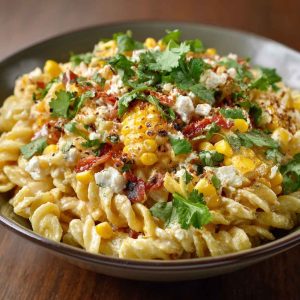 In pasta salad form, the grilled or roasted corn kernels are mixed into cooked pasta, coated with a creamy chili-lime dressing, and finished with cheese and herbs. The pasta provides heartiness, while the elote-inspired toppings bring that same bold flavor punch. The creamy base balances the smoky char of the corn, the chili provides warmth, and the lime keeps everything bright and refreshing.