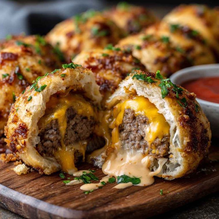 Garlic Parmesan Cheeseburger Bombs are bite-sized stuffed dough pockets filled with seasoned ground beef, gooey cheese, and fragrant garlic, topped with a buttery parmesan crust. Perfect as a party appetizer, game day snack, or casual dinner, these bombs combine classic cheeseburger flavors in an irresistible, easy-to-make finger food that’s sure to impress.