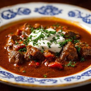 This lighter version has more broth, making it a comforting soup rather than a thick stew. It’s perfect for warming up on a chilly day or serving as a starter in multi-course meals. The flavor is the same signature paprika-spiced beef but with a more delicate, soup-like consistency.