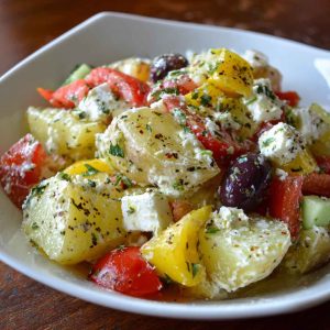 Greek Potato Salad is the perfect upgrade to your classic picnic side. This Mediterranean version skips the heavy mayo in favor of something fresher, lighter, and endlessly flavorful. Imagine warm, tender potatoes tossed in a lemony olive oil dressing, finished with briny olives, crumbled feta, and a shower of fresh herbs. It’s creamy without cream, rich without being heavy, and vibrant enough to steal the show at any barbecue or mezze spread.