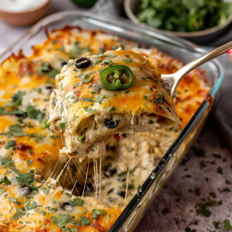 Green Chile Chicken Enchilada Casserole is a layered Mexican-inspired dish that combines the flavors of green chiles, chicken, cheese, and tortillas, all baked together in a creamy, spicy sauce. It simplifies the traditional process of making individual enchiladas by creating a casserole, making it a quicker and easier option for a delicious, comforting meal.