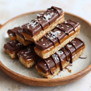 Nut-Free Version: Use oat flour for the base and sunflower seed butter or tahini for the caramel.