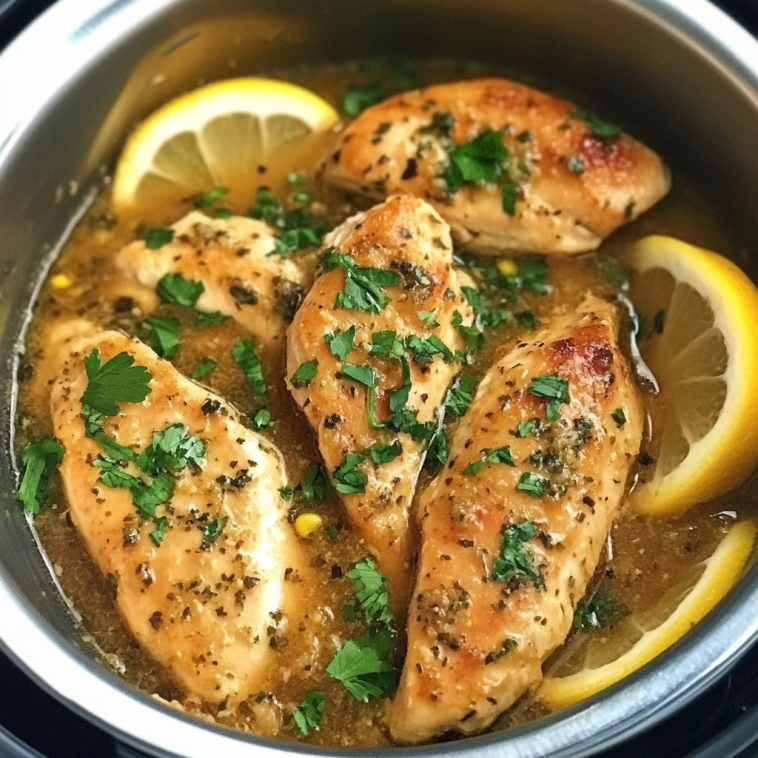 - Remove the chicken and set it on a plate. You can switch the Instant Pot back to sauté mode and simmer the sauce for a few minutes to thicken if desired. Pour the sauce over the chicken and garnish with chopped parsley and lemon slices.