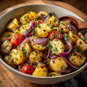This salad hits all the right notes: creamy, tangy, fresh, and vibrant. The magic starts with tender baby potatoes, which soak up the bold balsamic dressing like flavor sponges. That dressing—zippy, slightly sweet, and rich—elevates the humble spud into something crave-worthy. Toss in a handful of chopped herbs like parsley or basil, and you’ve got a burst of garden-fresh brightness. Add colorful veggies—think cherry tomatoes, red onion, or bell peppers—and the salad becomes a visual feast. Best of all? No mayo. That means no gloopy texture, no refrigeration anxiety, and no overpowering taste. Just clean, bold flavors that let the ingredients shine. It’s the kind of dish that feels indulgent but is secretly wholesome. Whether served warm or chilled, it’s guaranteed to disappear fast.