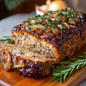 This meatloaf adapts those signature flavors into a solid, sliceable form. Instead of a soup bowl, you get a warm, tender loaf packed with caramelized onions throughout, infused with the aromatic broth flavors, and finished with a bubbly, cheesy crust that mirrors the soup’s cheesy top.