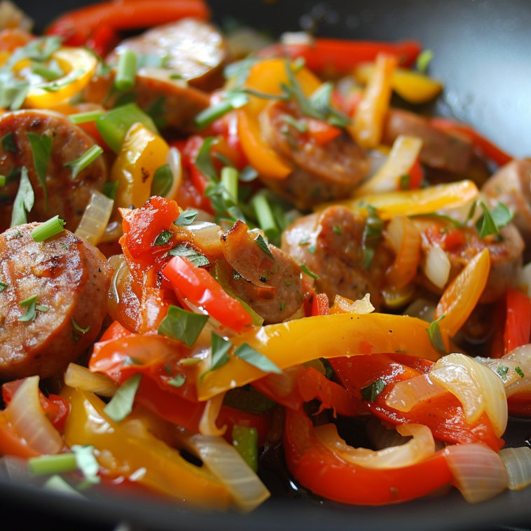 - Return the cooked sausage links to the skillet with the vegetables. Reduce the heat to low and let everything simmer together for another 5-10 minutes to allow the flavors to meld. Season with salt and pepper to taste.