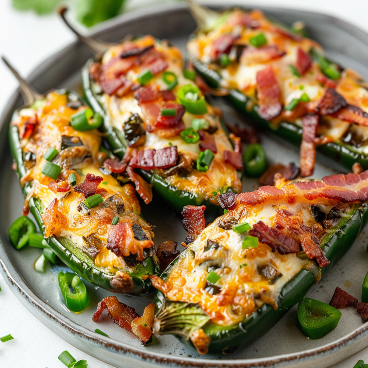 Jalapeno Poppers with Bacon are a popular appetizer made by stuffing halved jalapeno peppers with a cheesy filling, often cream cheese mixed with other ingredients like cheddar cheese or spices, then wrapping them in bacon and baking until crispy. Here’s a simple recipe to make them: