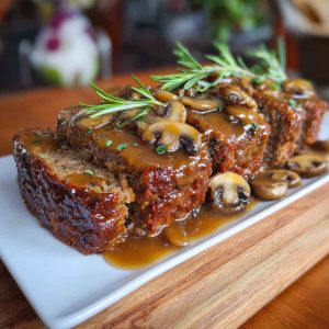 Slice the rested meatloaf and generously spoon mushroom gravy over each serving. Pair with mashed potatoes, green beans, or roasted vegetables for a complete comfort meal.