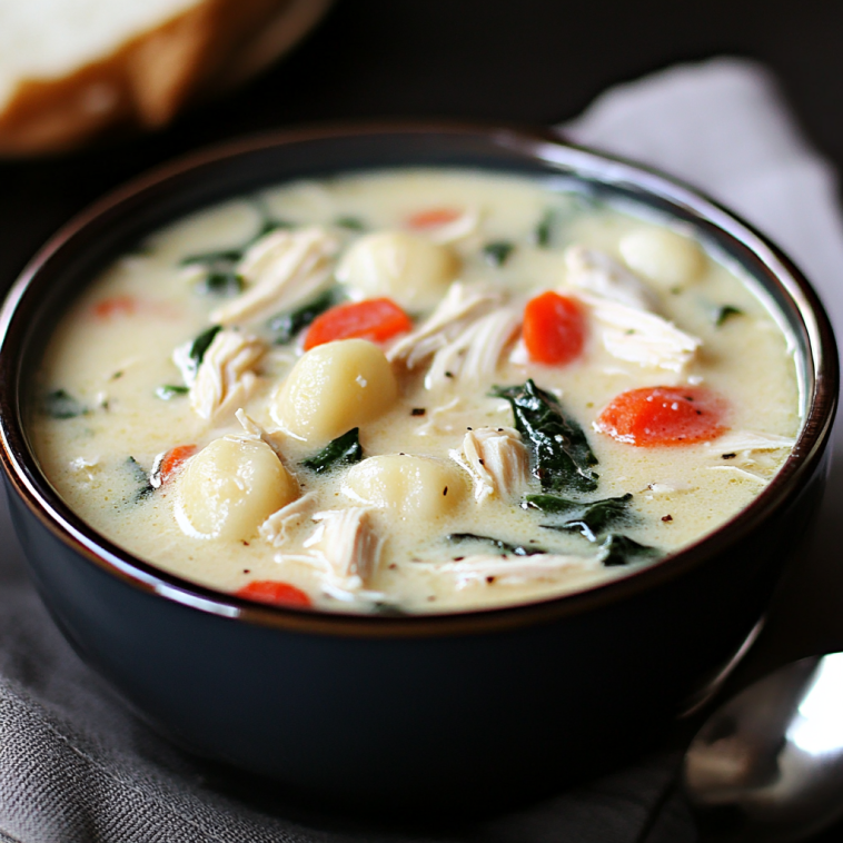 • Ingredients: Chicken, gnocchi, carrots, celery, spinach or kale, garlic, and cream or milk for the rich broth.