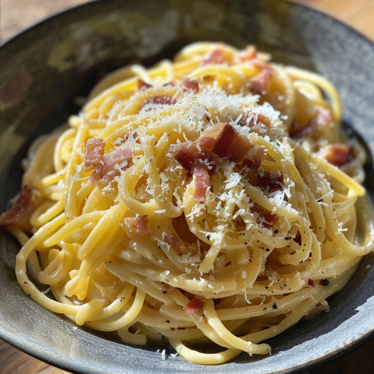 Spaghetti carbonara is a classic Italian pasta dish known for its creamy texture and rich flavor. It typically consists of pasta (usually spaghetti), eggs, cheese (often Pecorino Romano or Parmesan), pancetta or guanciale (cured pork cheek or jowl), and black pepper. Here’s a traditional recipe for spaghetti carbonara: