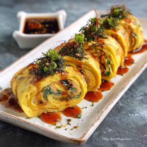 - Finish and Slice: Cook the rolled omelette for an additional minute to firm up. Remove from pan and let rest for 2-3 minutes. Slice into bite-sized pieces.