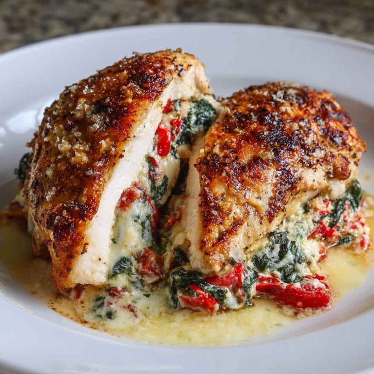 At its core, it’s a simple yet impressive recipe: chicken breasts are sliced open (butterflied), stuffed with a blend of sautéed spinach, roasted red peppers, and creamy mozzarella, then seared and roasted until juicy and golden.