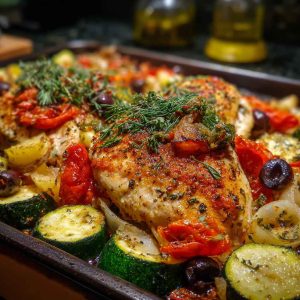 Picture this: tender, golden-brown chicken infused with the fragrance of oregano, thyme, and smoky paprika, nestled among slices of sweet, caramelized zucchini. As everything roasts together, the kitchen fills with the irresistible aroma of garlic mingling with a burst of fresh lemon zest. Dinner is about to be served — and it’s not just delicious, it’s effortless.