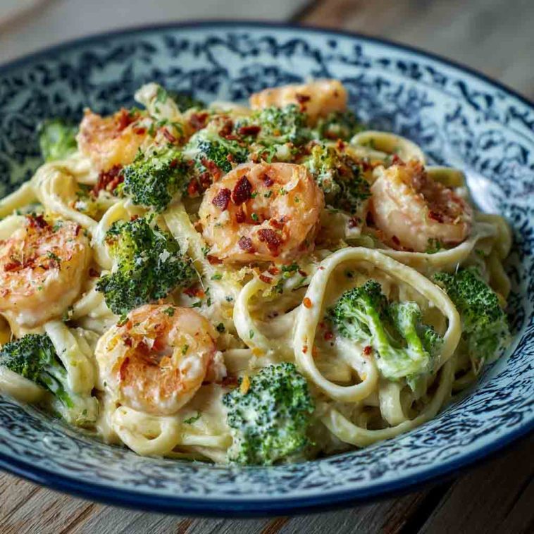 Shrimp and Broccoli Alfredo is a creamy pasta dish rooted in Italian-American cooking. Inspired by the classic fettuccine Alfredo, this version adds sautéed shrimp and lightly cooked broccoli for a balanced, one-bowl meal.