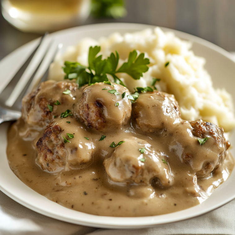 Return meatballs to the skillet and simmer in the gravy for 5–10 minutes.